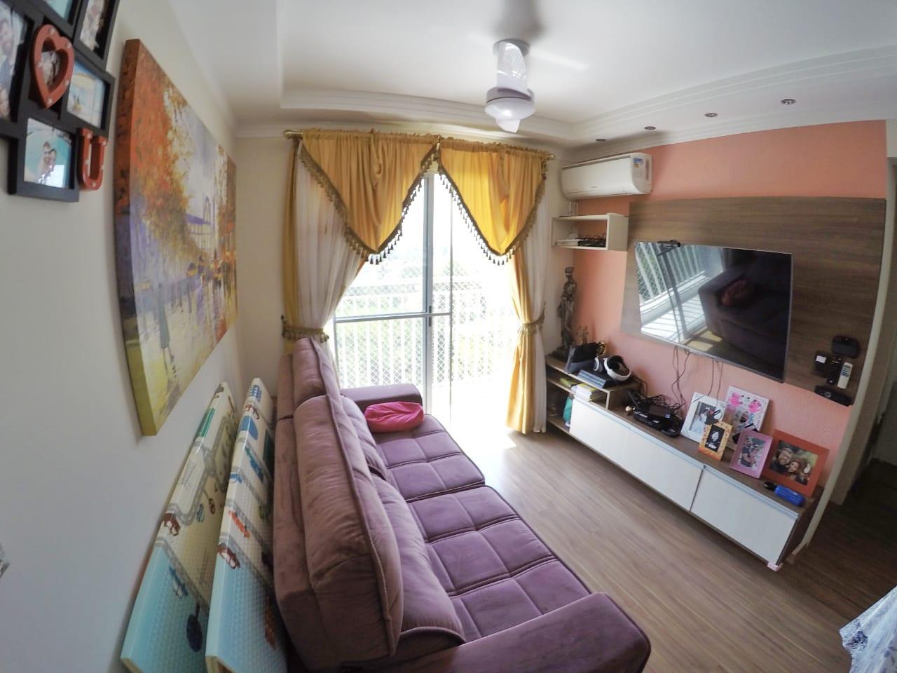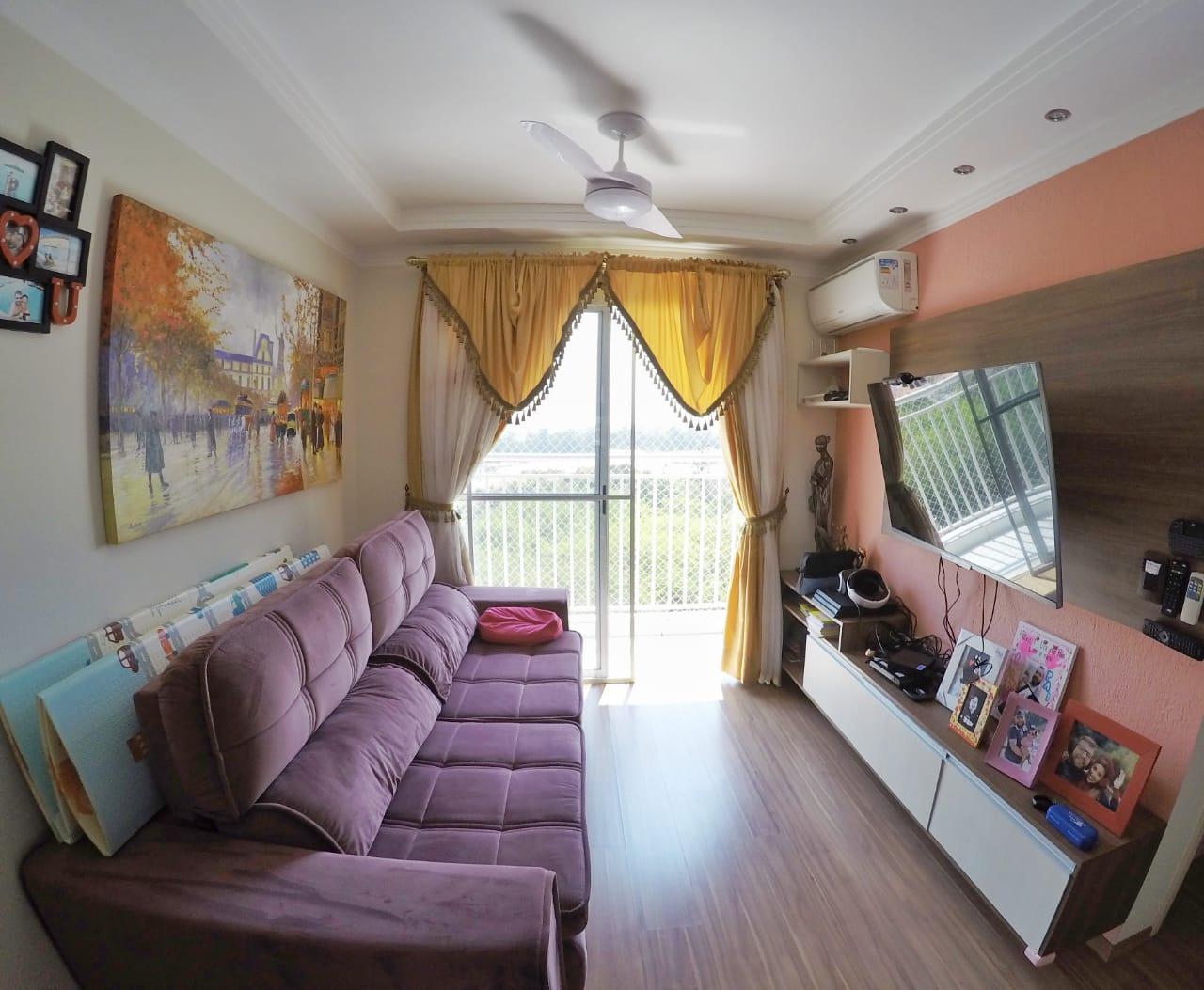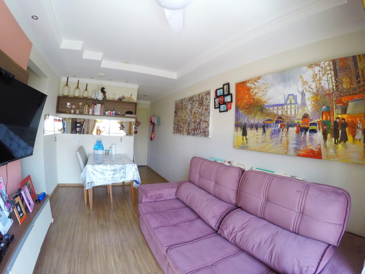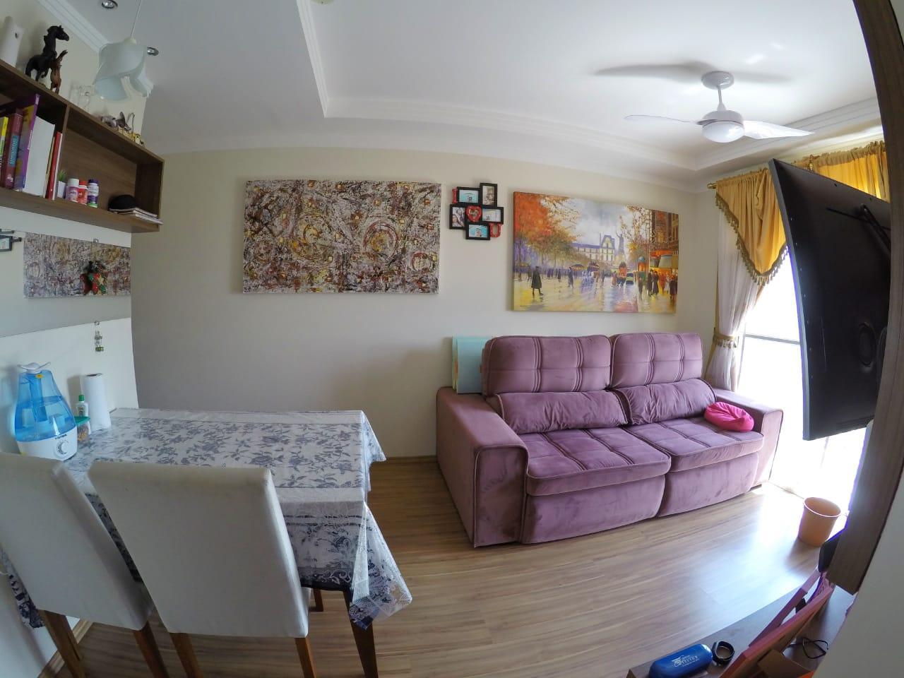 - Descrição: Descrição Apartamento no 6º andar com 2 dormitórios, sala 2 ambientes com ar condicionado e sacada, cozinha com modulados, garagem coberta para 1 carro, ventilador de teto e proteção nas janelas.